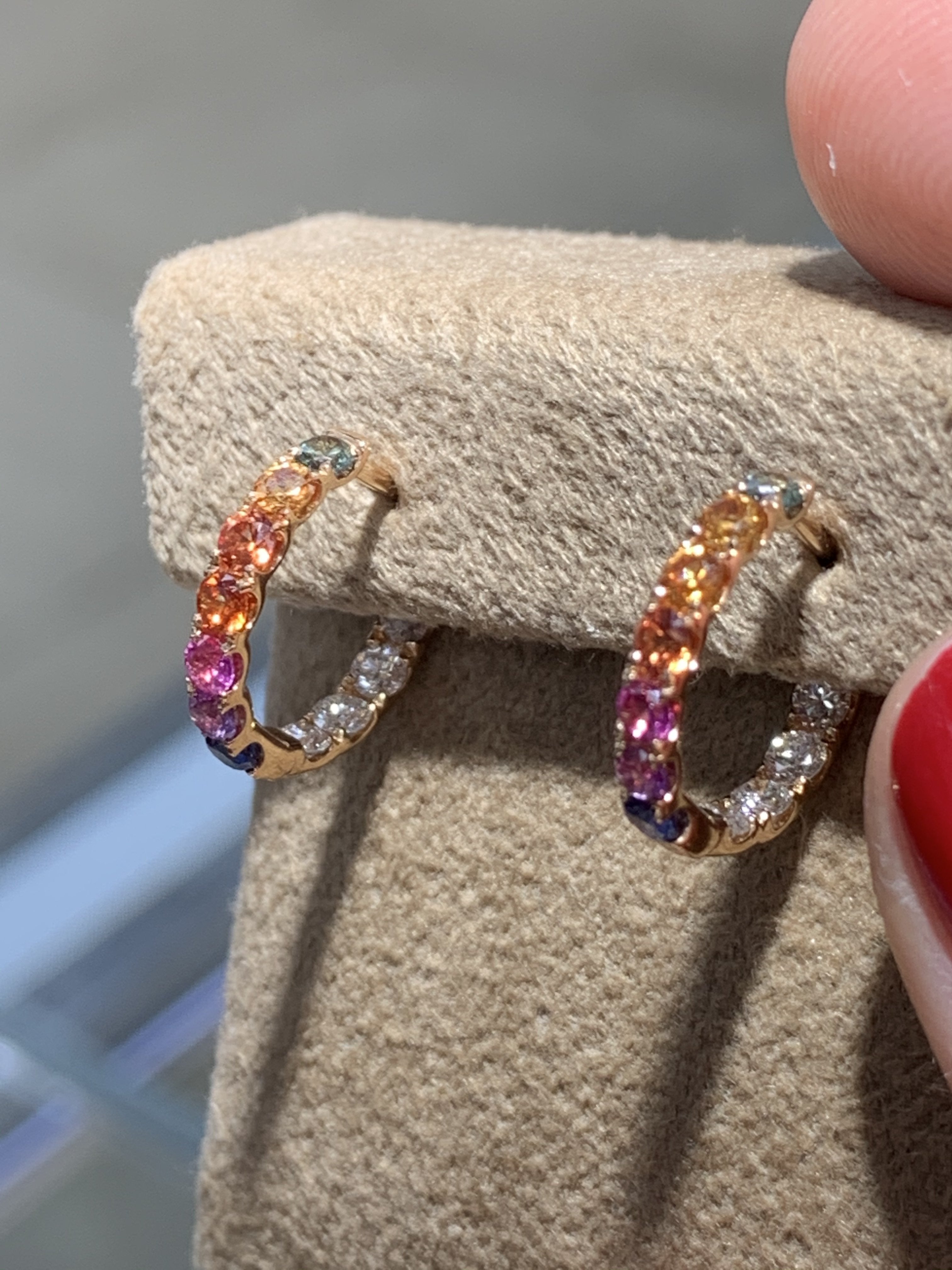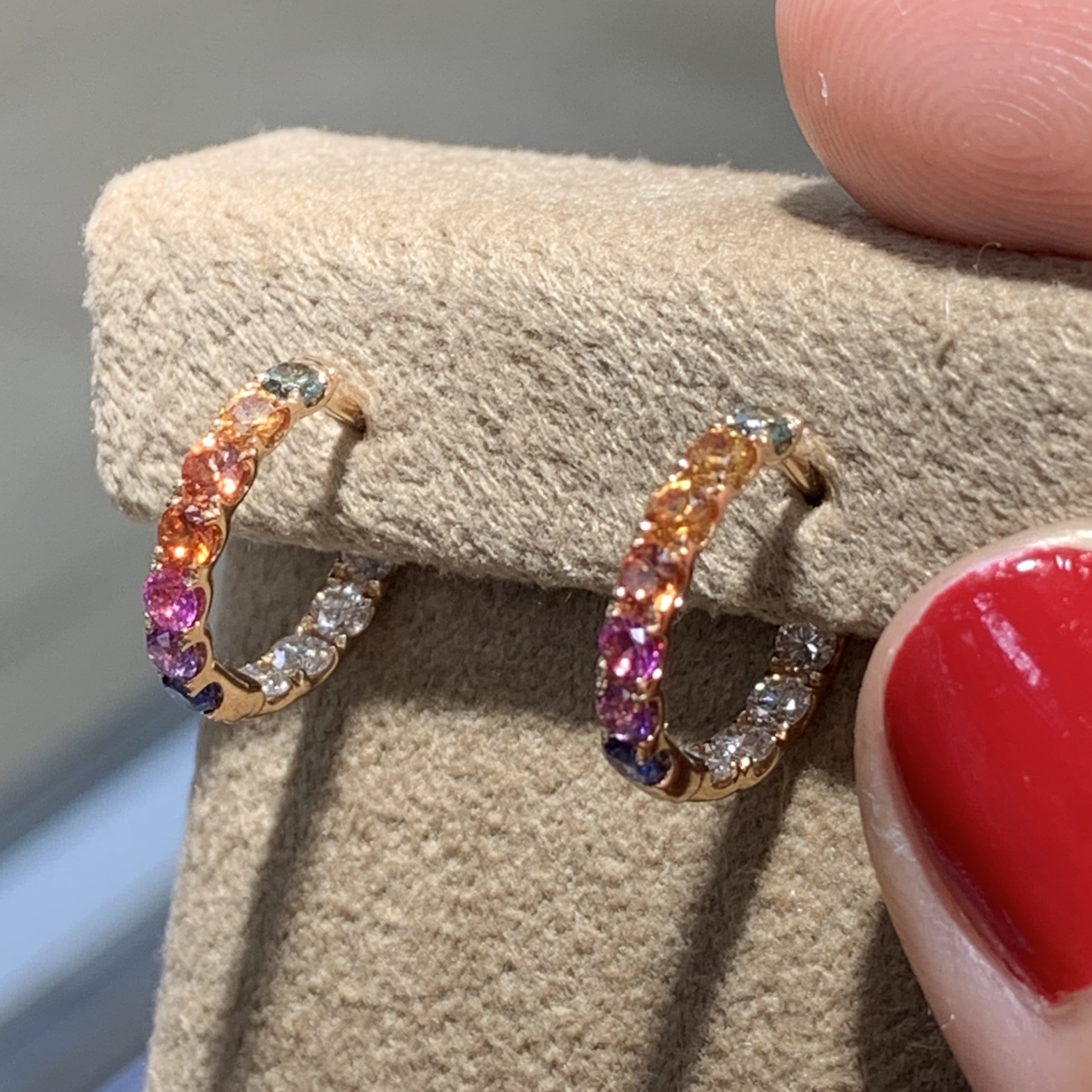 Boasting with classic versatile beauty, our 18k rose gold inside diamond out rainbow sapphire hoop earrings are destined to become an accessory favorite of yours. These diamond hoop earrings are ideal for everyday wear. Just be sure to not miss out on such a delicious deal.