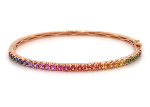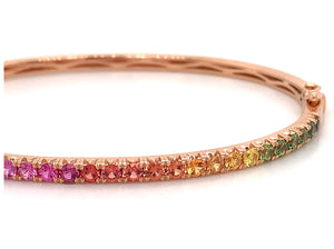 Bangles are great for stacking, but with this bold and beautiful rainbow sapphire bangle bracelet, you only need one! This 18kt rose gold bracelet is simply covered in round rainbow sapphires... Metal: 18kt Rose Gold Sapphire Weight: 1.83ctw Sapphire Shape: 28 Round Bangle/Wrist Width: 5.3cm x 6.3cm Bangle Height: 3mm