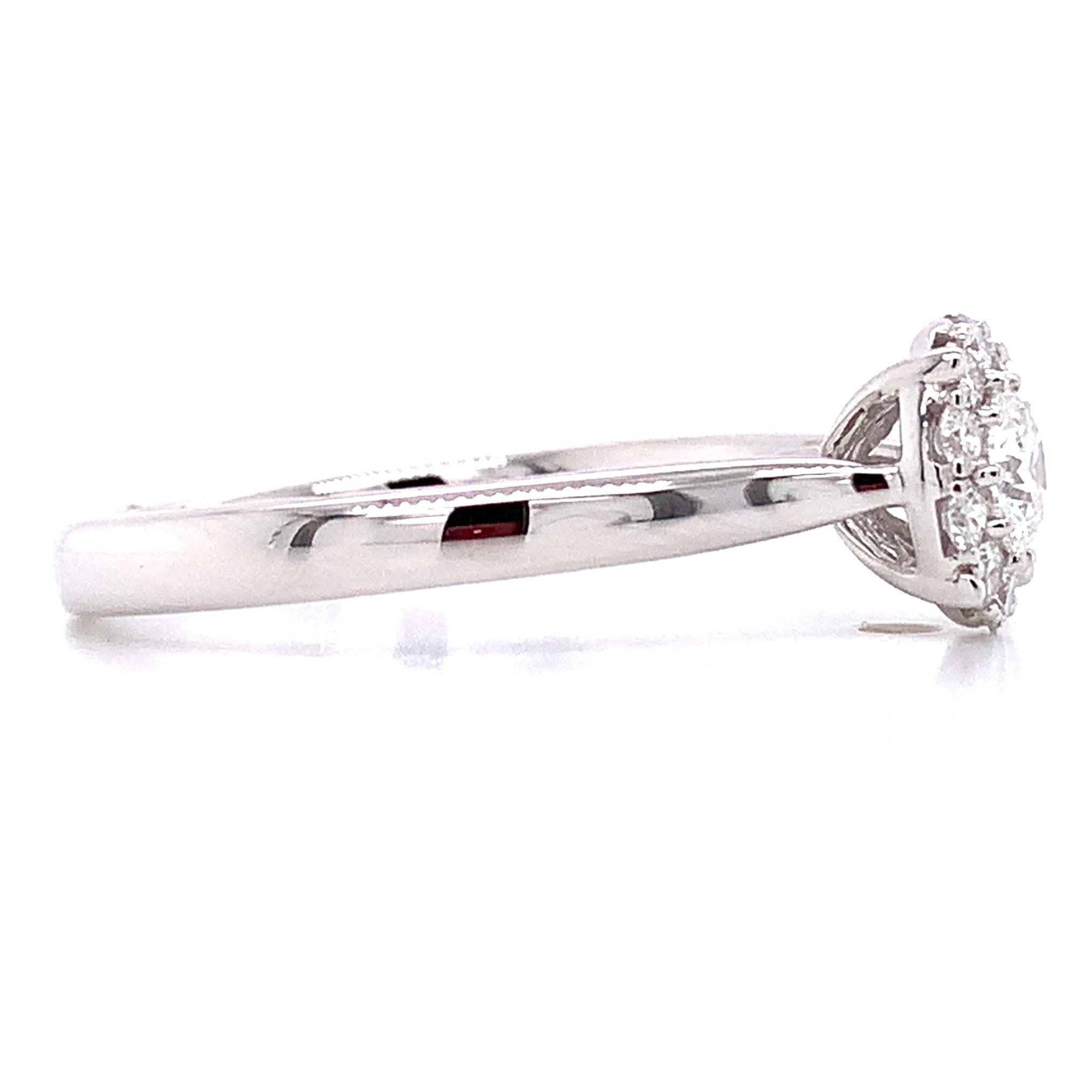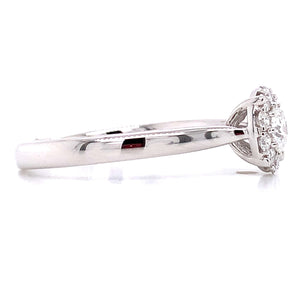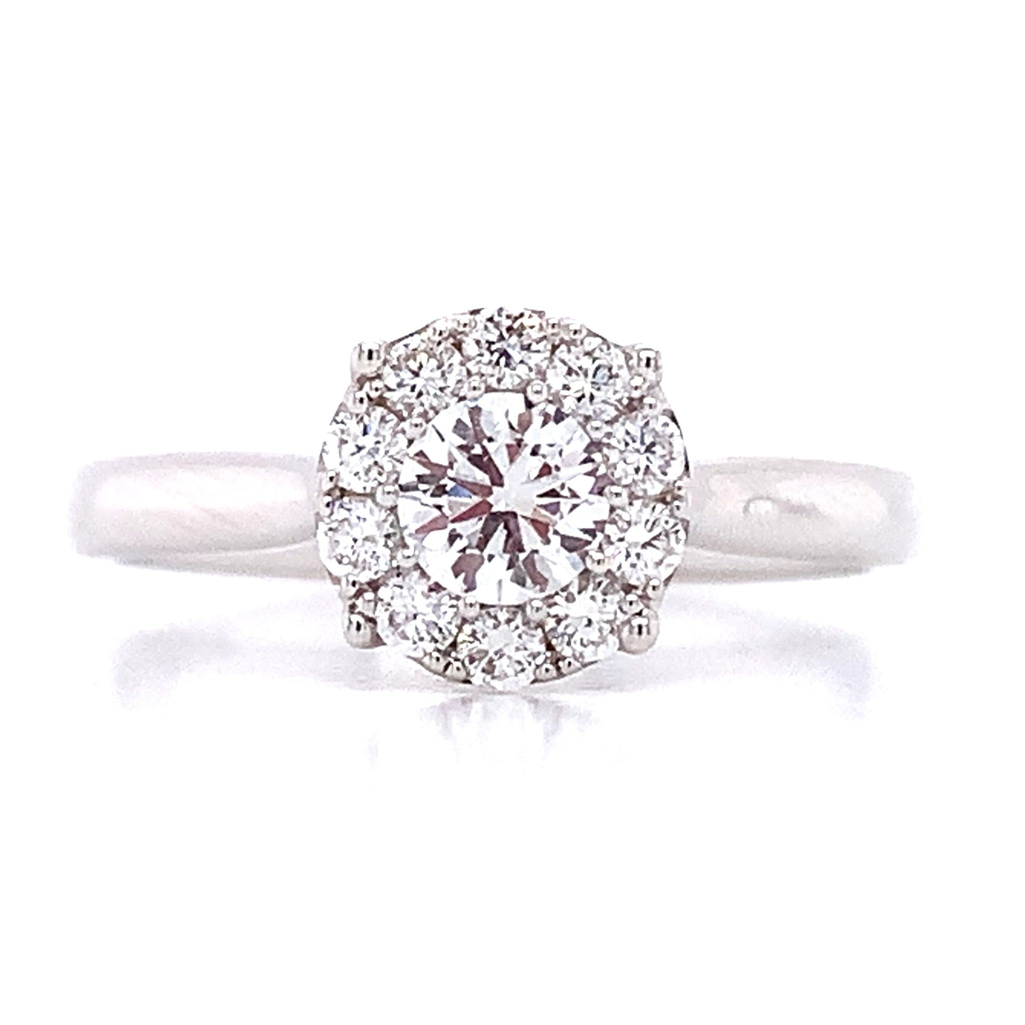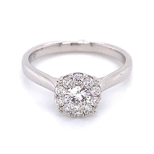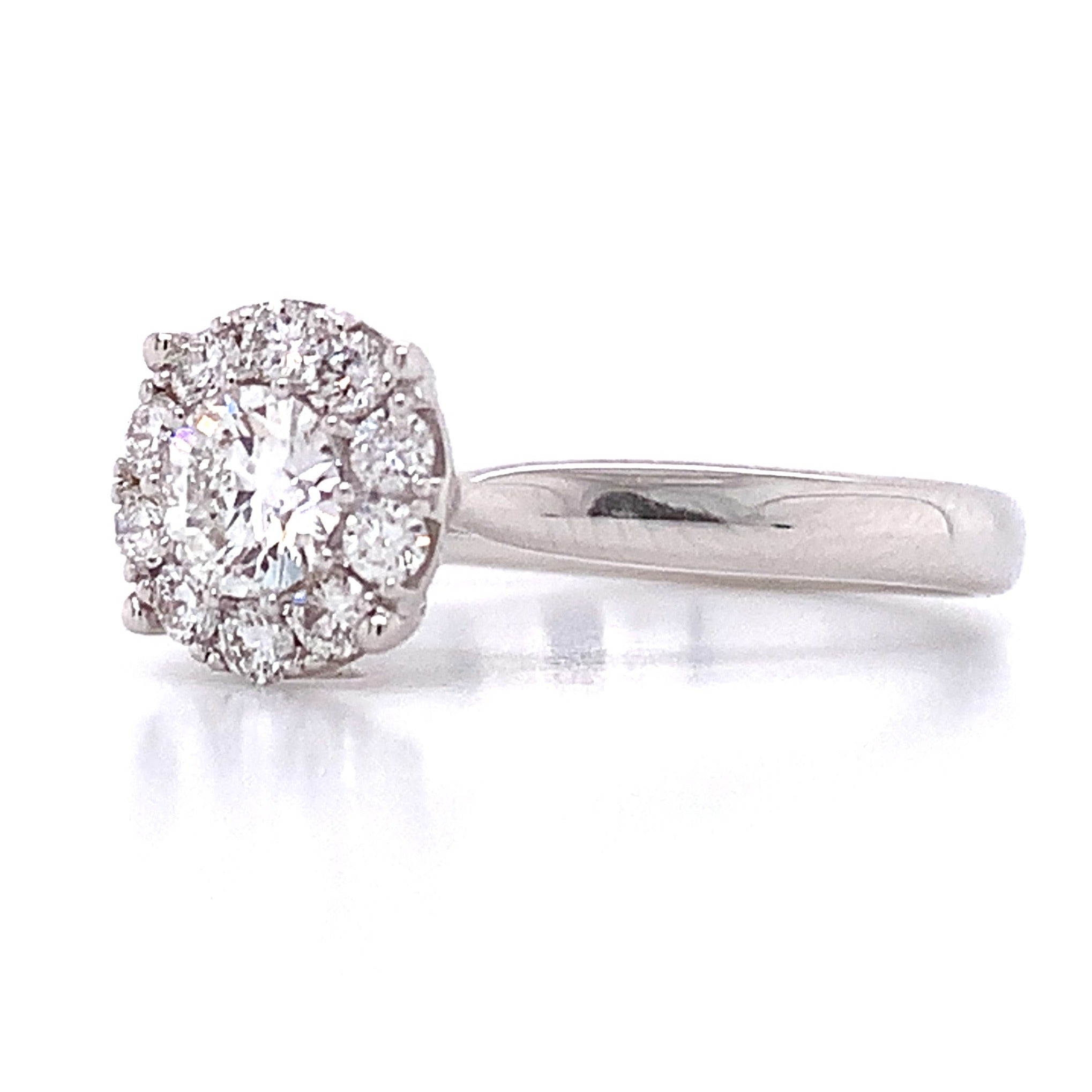 Indulge your loved one with an exquisite 0.86ct tw round brilliant-cut diamond halo white gold ring. Featuring a timeless white gold band and gorgeous round brilliant-cut diamond center stone, this stunning piece will cherish for generations to come!