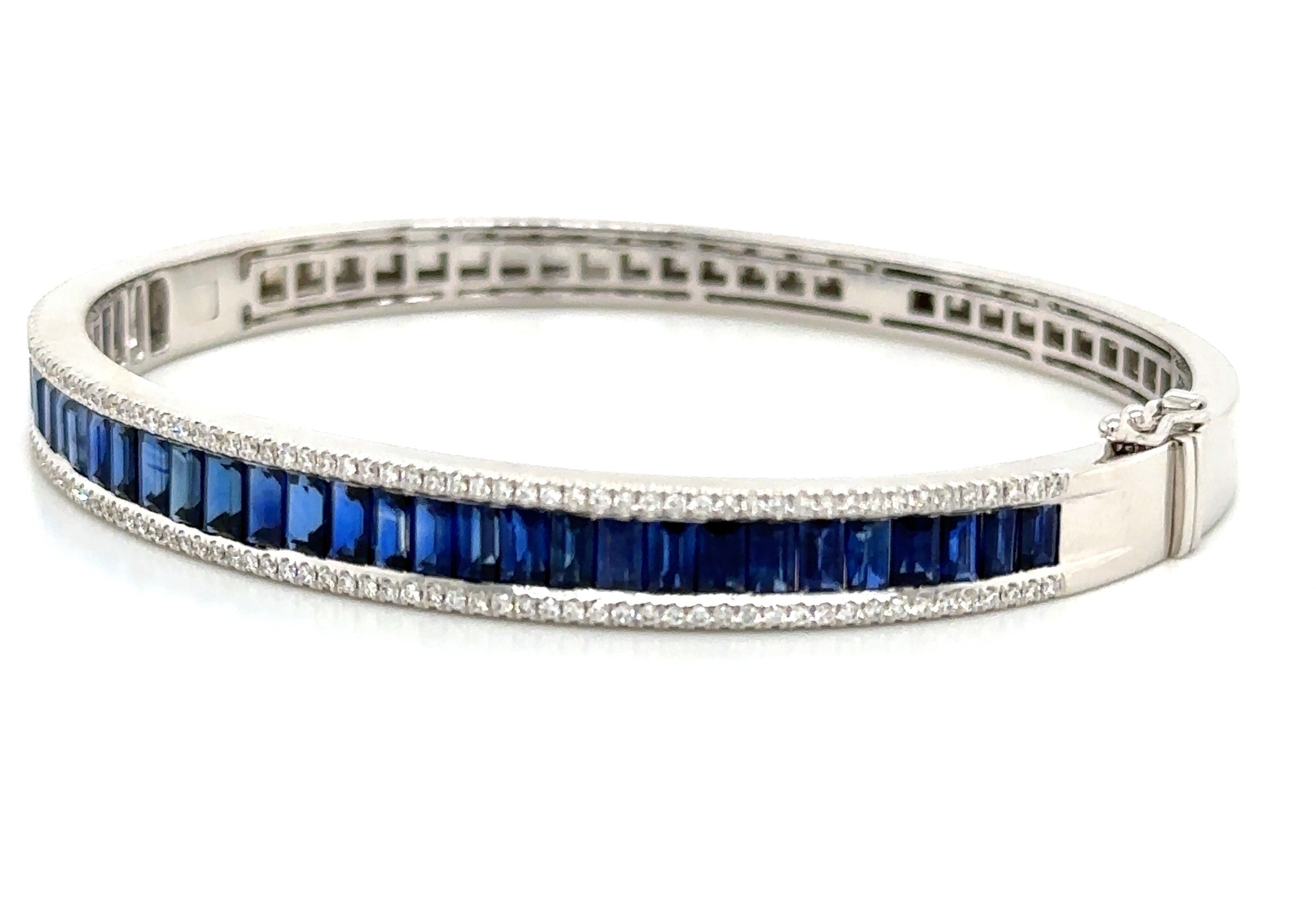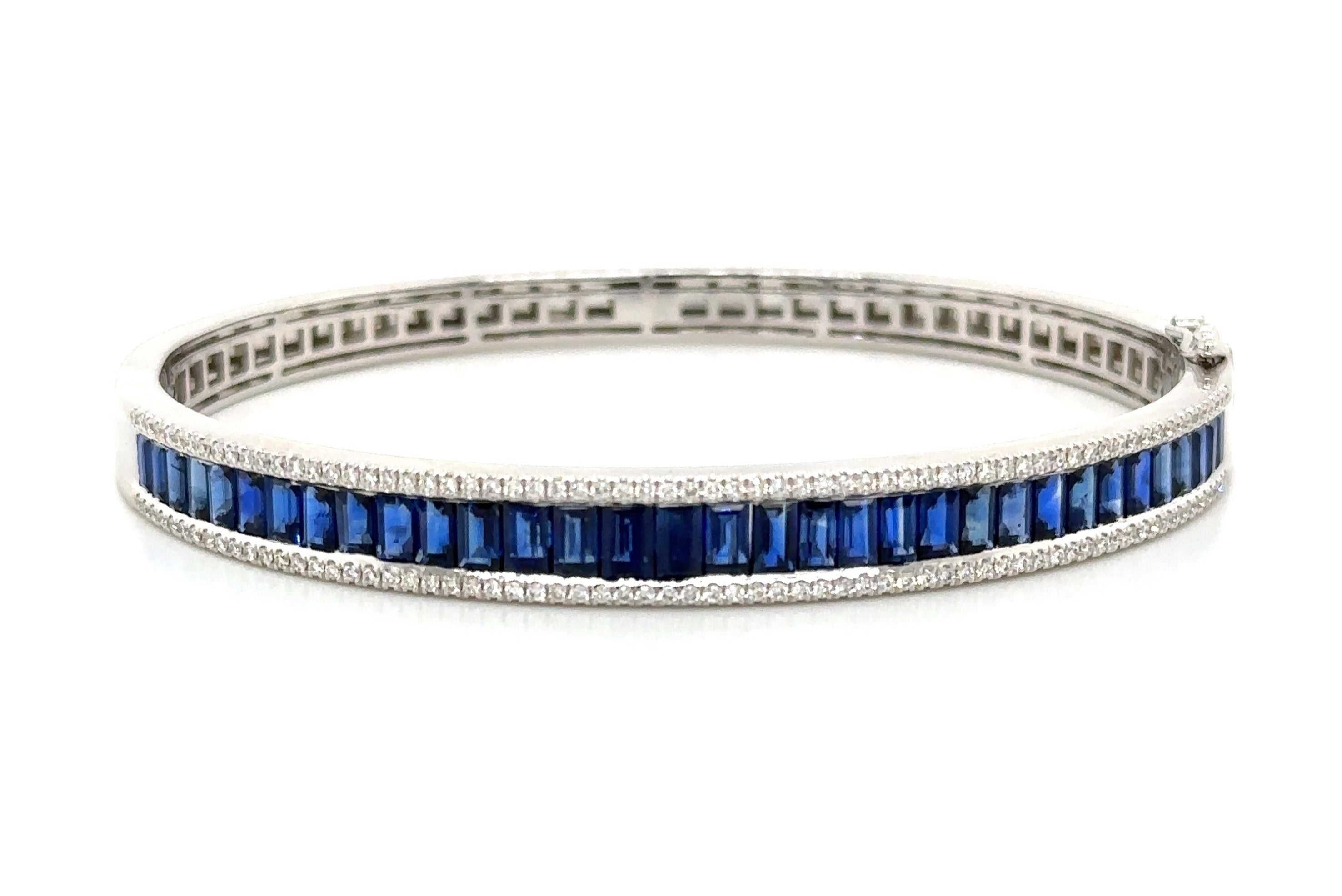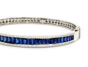 Bangles are great for stacking, but with this bold and beautiful blue sapphire & diamond bangle bracelet, you only need one! Metal: 18K White Gold Sapphire Weight: (33) 5.94ct tw Diamond Shape , Weight: (134) Round Brilliant-cuts 0.50ct t.w. Bangle/Wrist Width: 57mm x 48cm Bangle Weight: 8mm