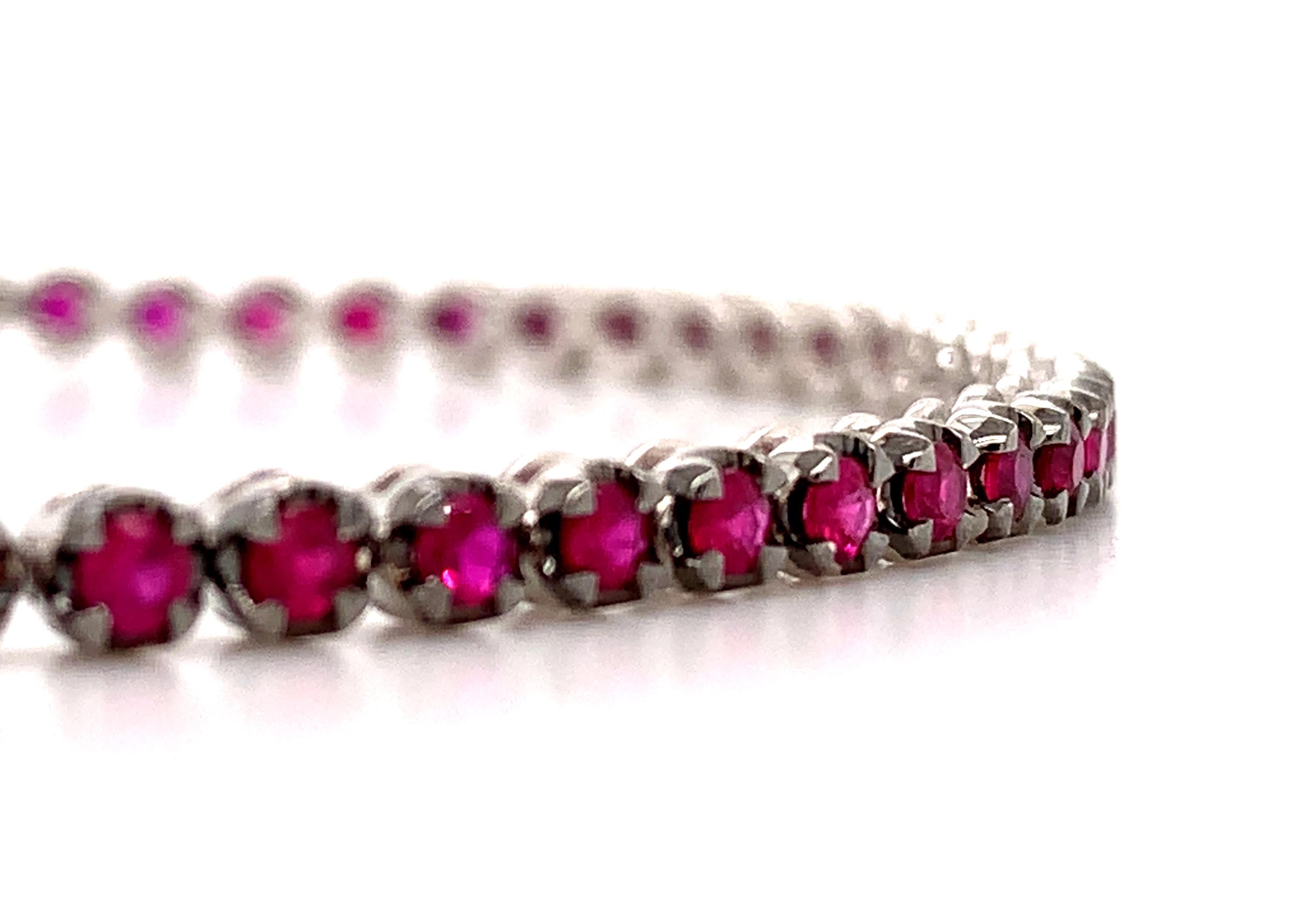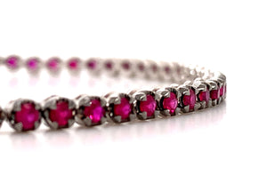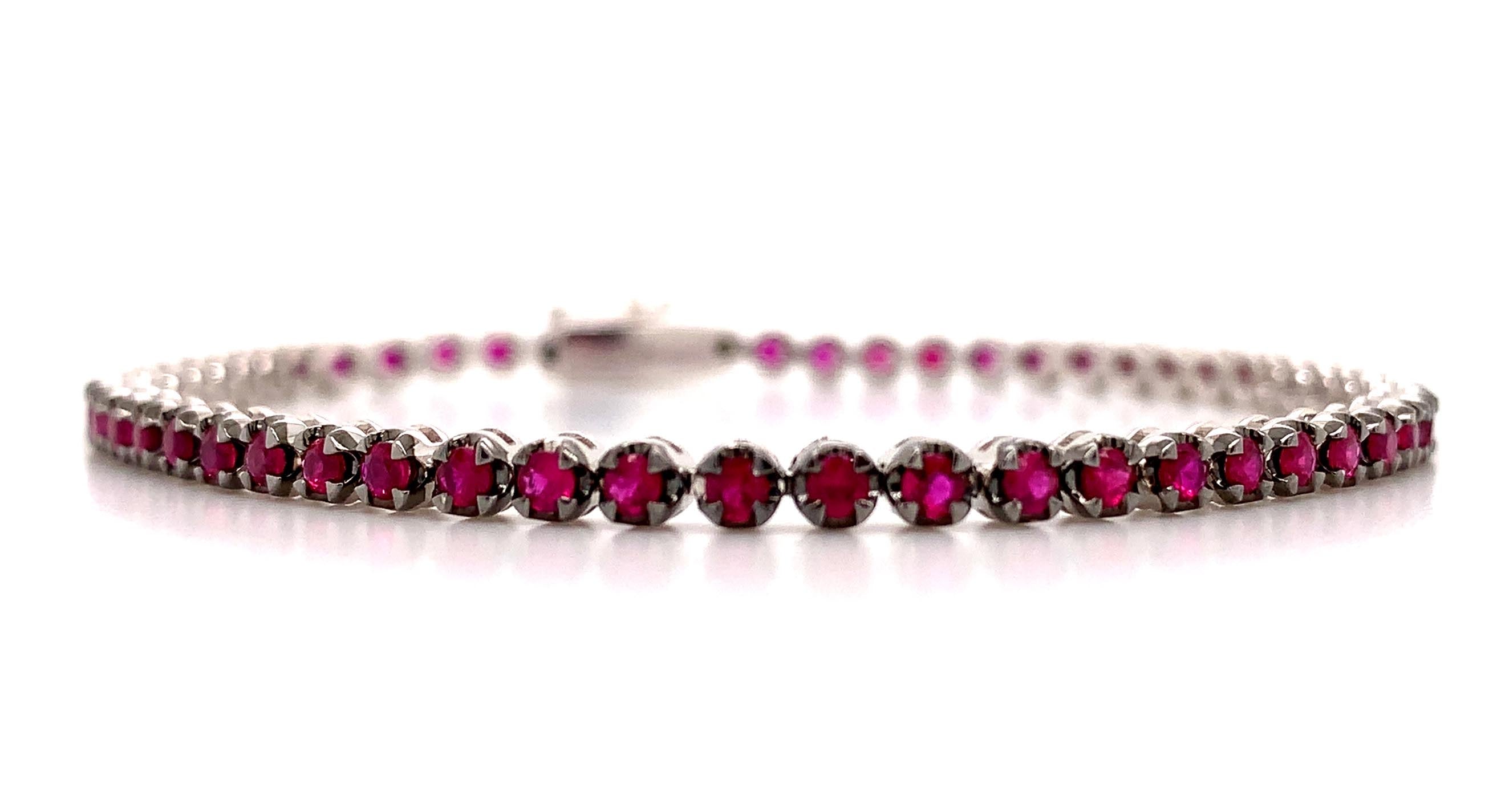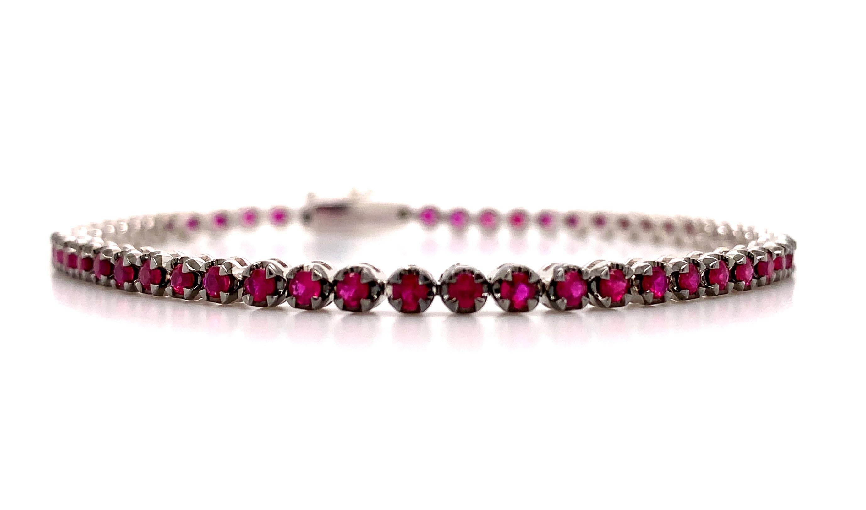 An eye-catching piece of classic workmanship, our ruby white gold black rhodium plated tennis bracelet is a must have. Versatile, great for stacking or solo. Metal: 18kt White Gold. Ruby Weight: (54) 2.32ct t.w. Bracelet Length: 18.5cm