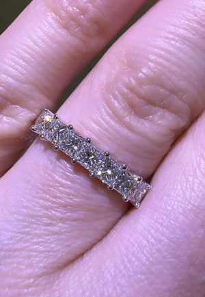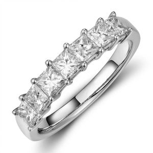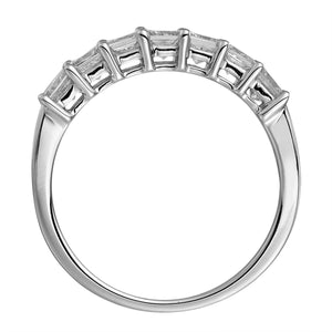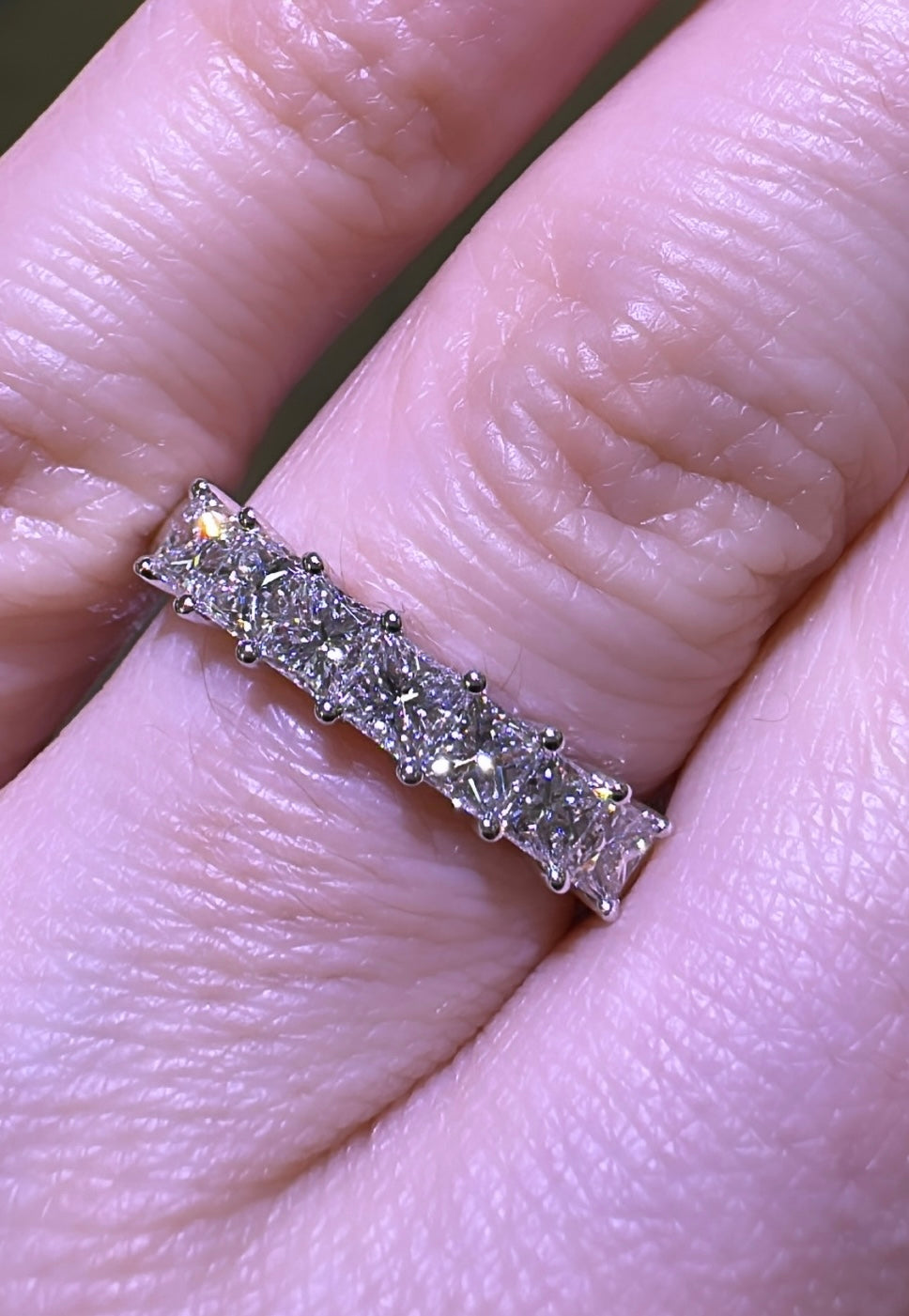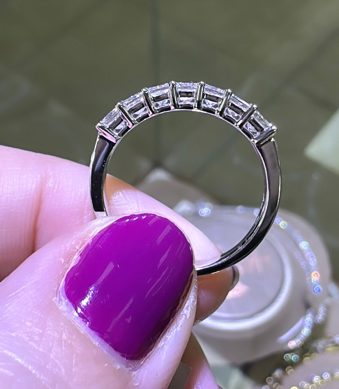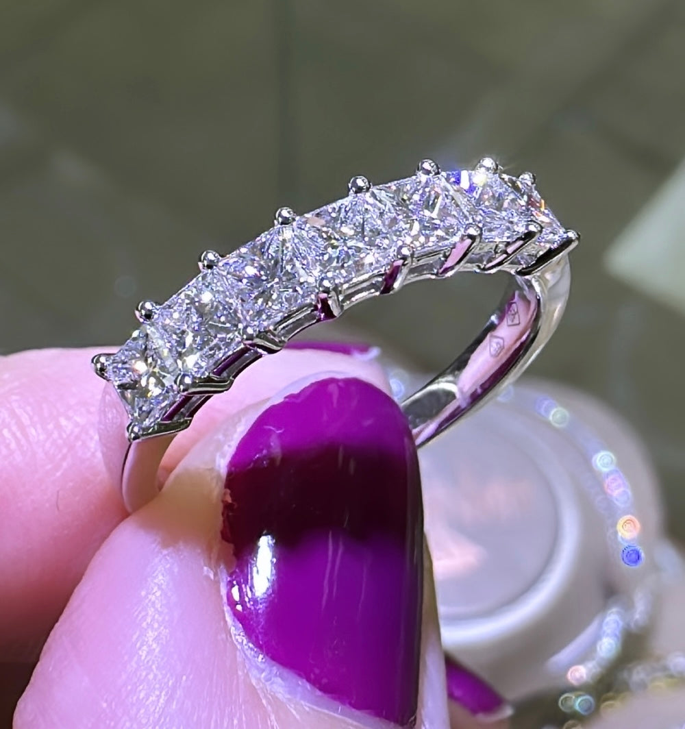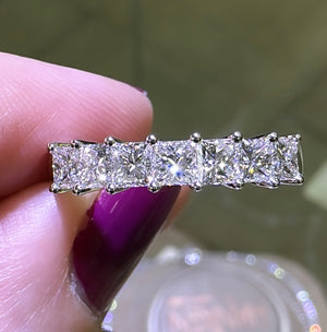 Our seven stone princess cut diamond wedding ring is something that we thought we could only dream about. Each stone is a gorgeous princess cut and the ring weighs in at a total of 1.15 carats. The rings is 4mm wide and makes for a bold sized wedding ring.
