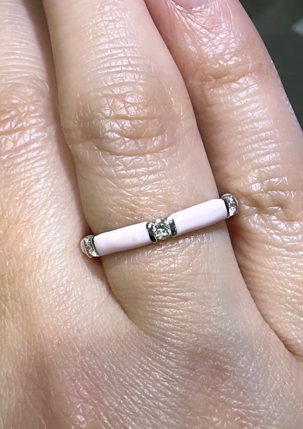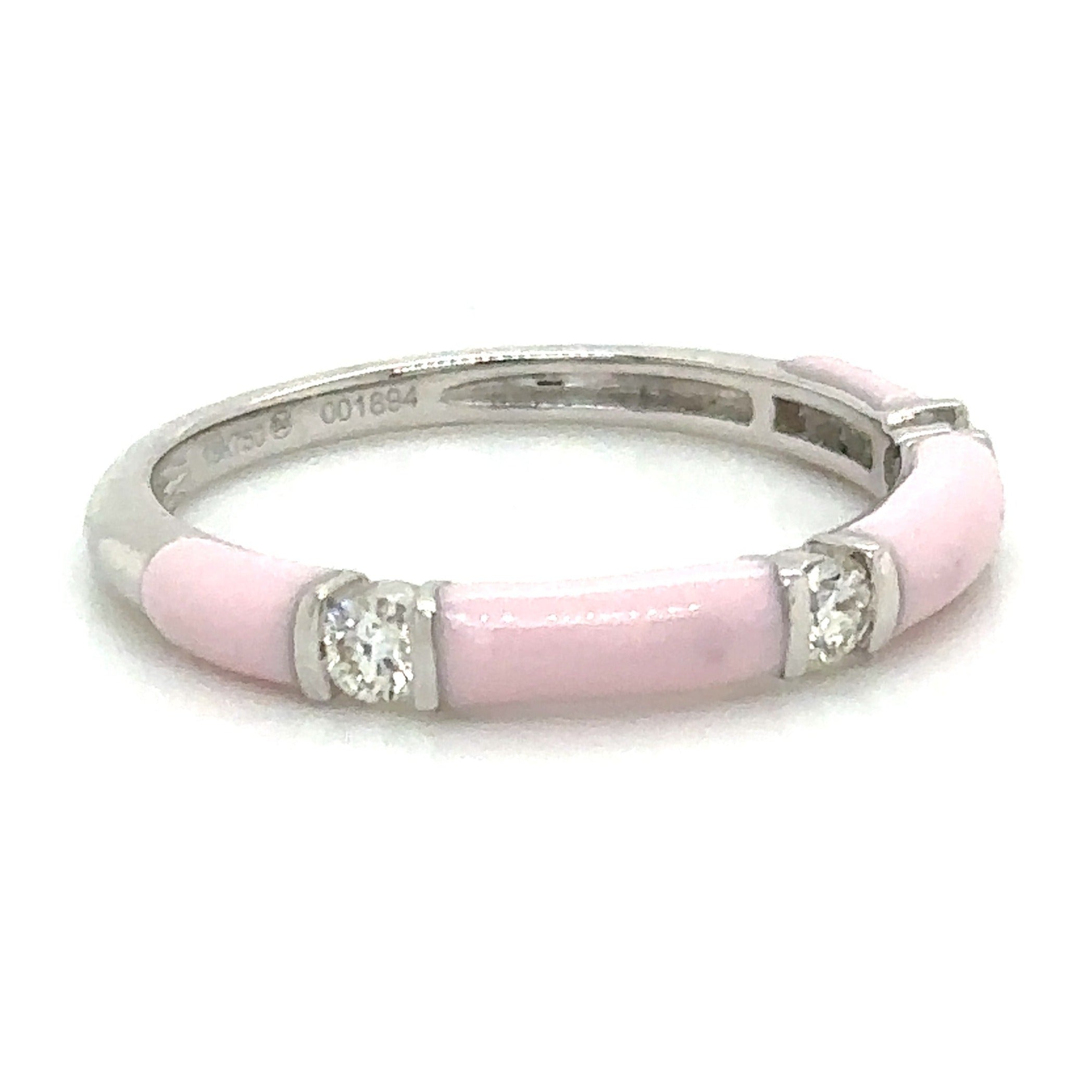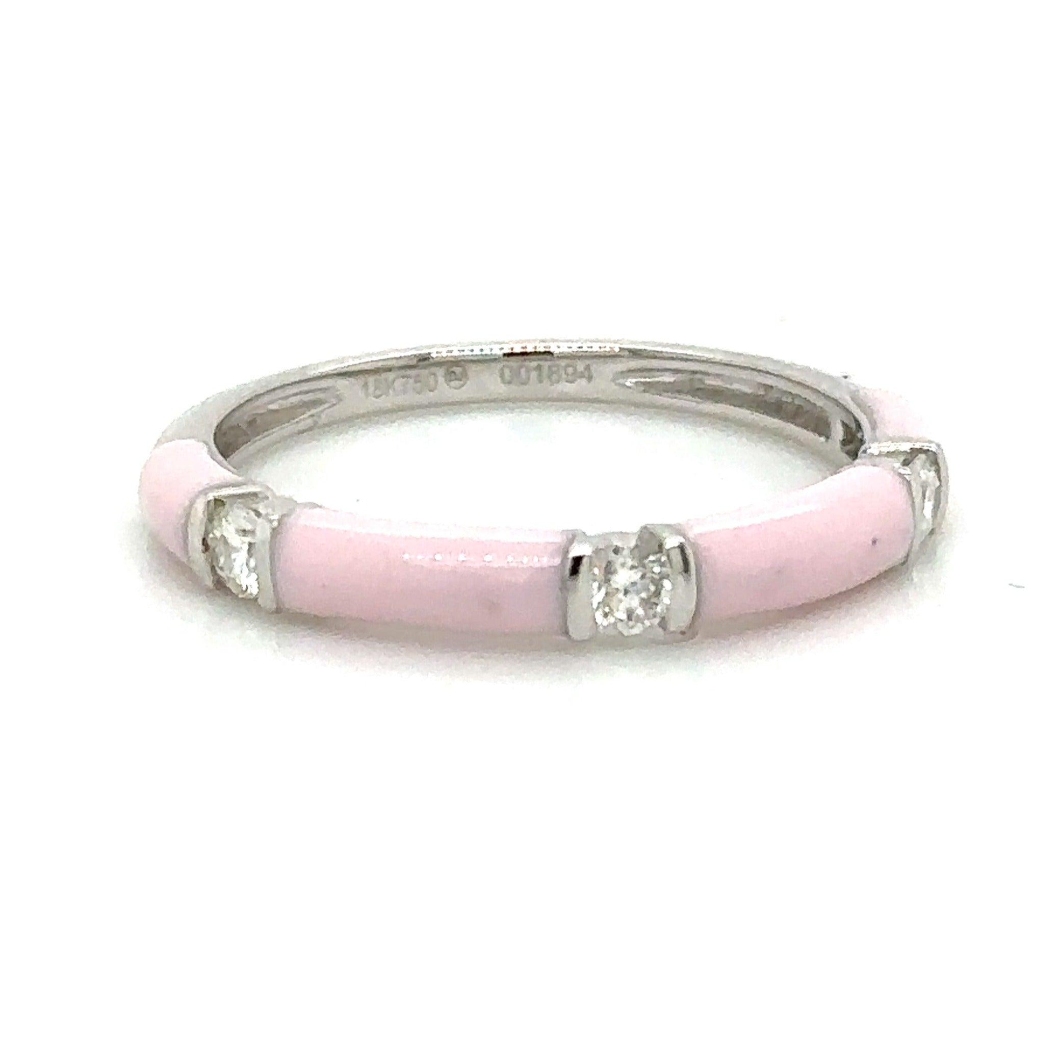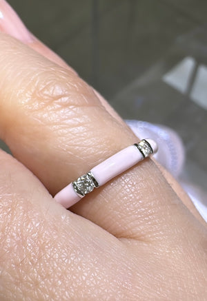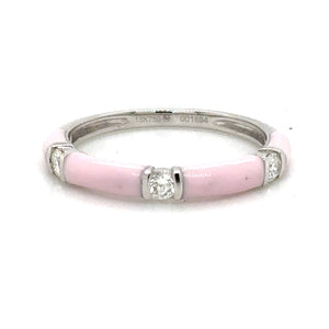 Let your look sparkle with three round diamonds and an exquisite pink enameled design that adds a touch of classic elegance and timeless beauty. Perfect for layering or wearing alone, this ring will make any outfit shine!