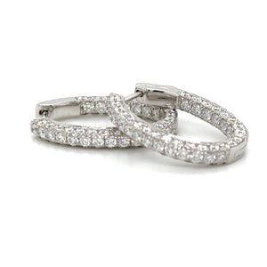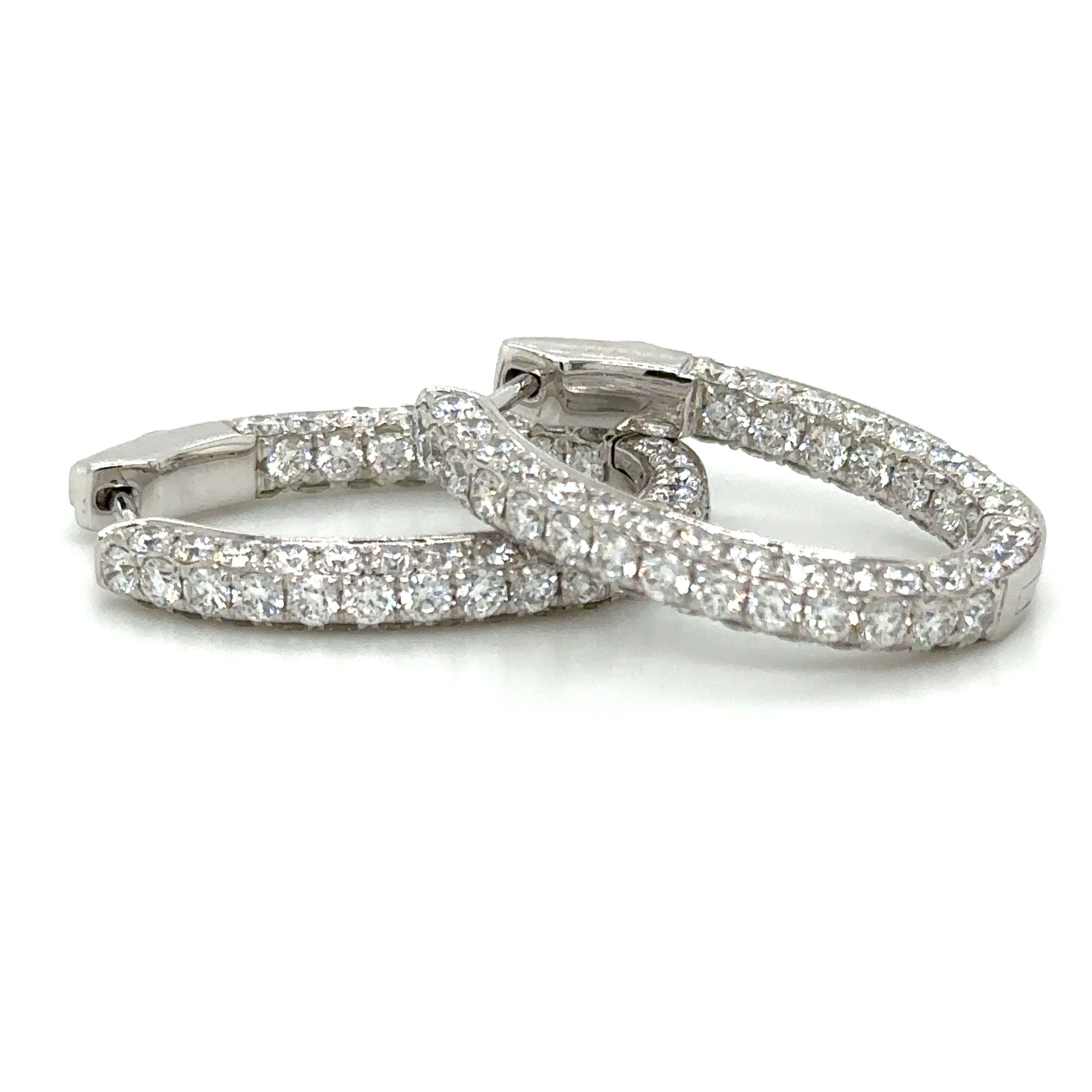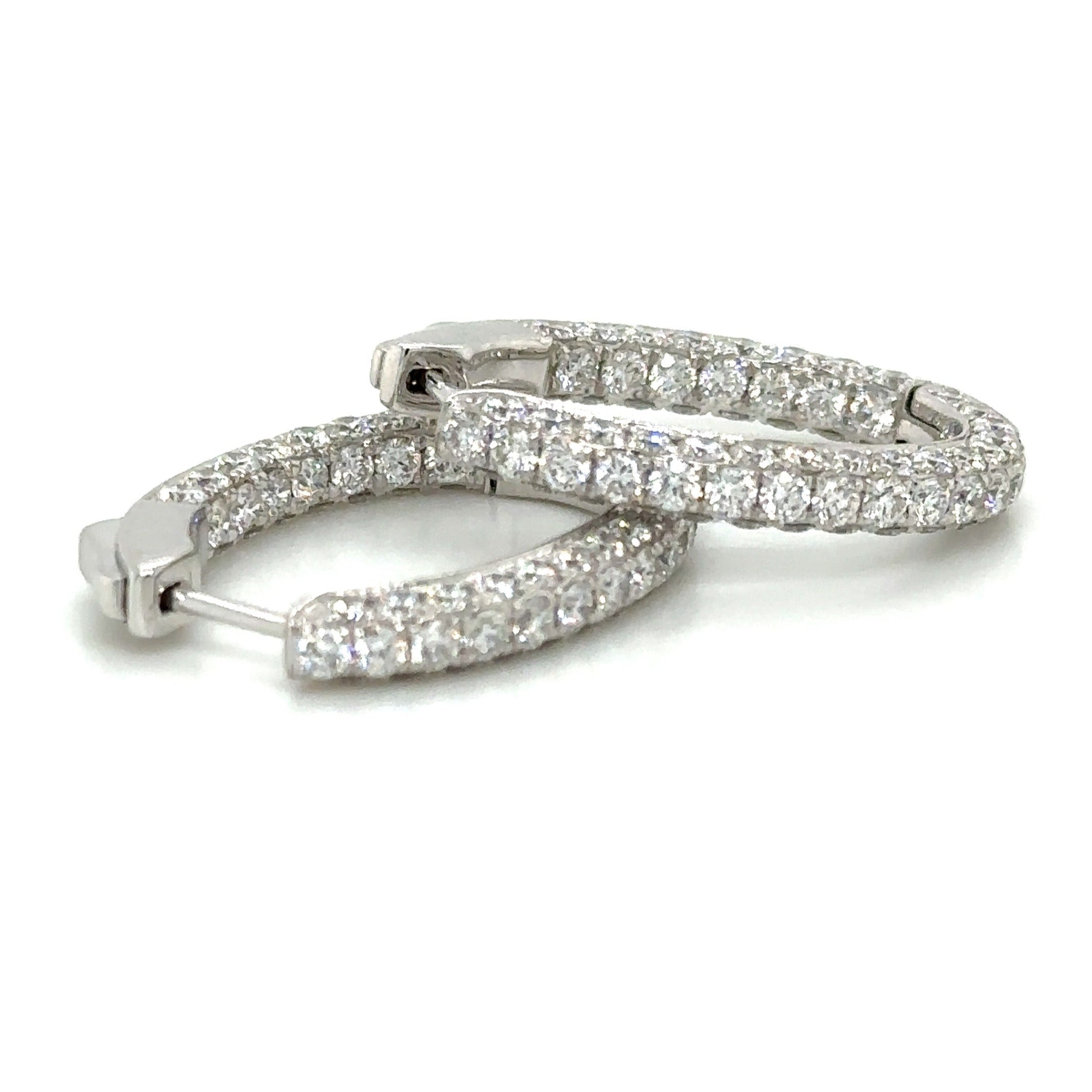 These oval diamond hoop earrings have been given a stylish touch with an elegant round cut diamonds placed inside and out. 18K white gold hoop earrings are set with 3.98carats 3 rows round diamonds. Every woman can always use a pair of classic diamond hoop earrings to add to their wardrobe. Accessorize with these hoop earrings for fun and casual looks, or formal occasions where you want the focus to be on your outfit.